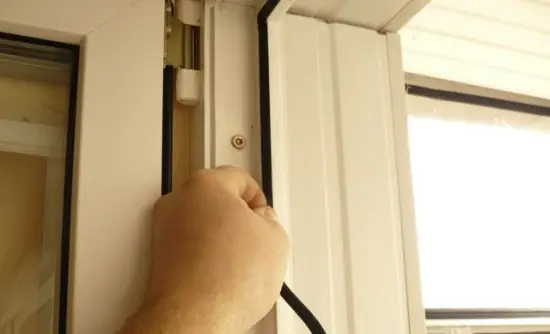 - Зачастую регулировка балконной пластиковой двери связана с заменой уплотнителя (как в верхней части, так и в нижней). Действуем аналогичным образом: снимаем заглушку и прижимаем винт шестигранником;