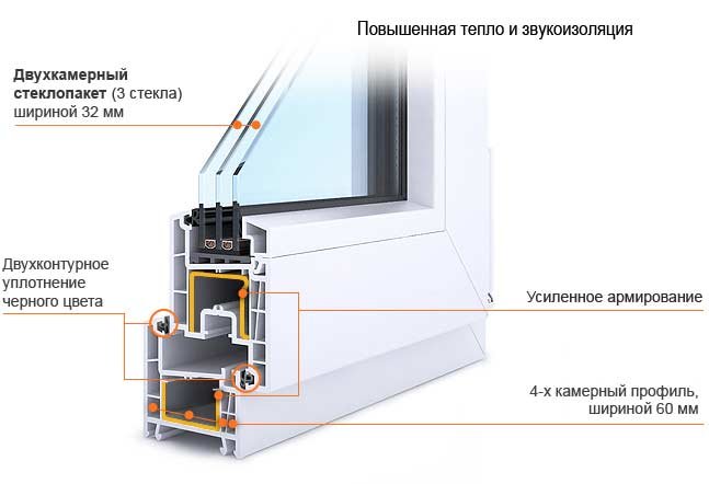 - Для максимальной теплоизоляции: окна с 5-камерной системой (ширина профиля составляет 7 см), или со специальным 2-камерным стеклопакетом, ширина стекла в котором достигает 4 мм.